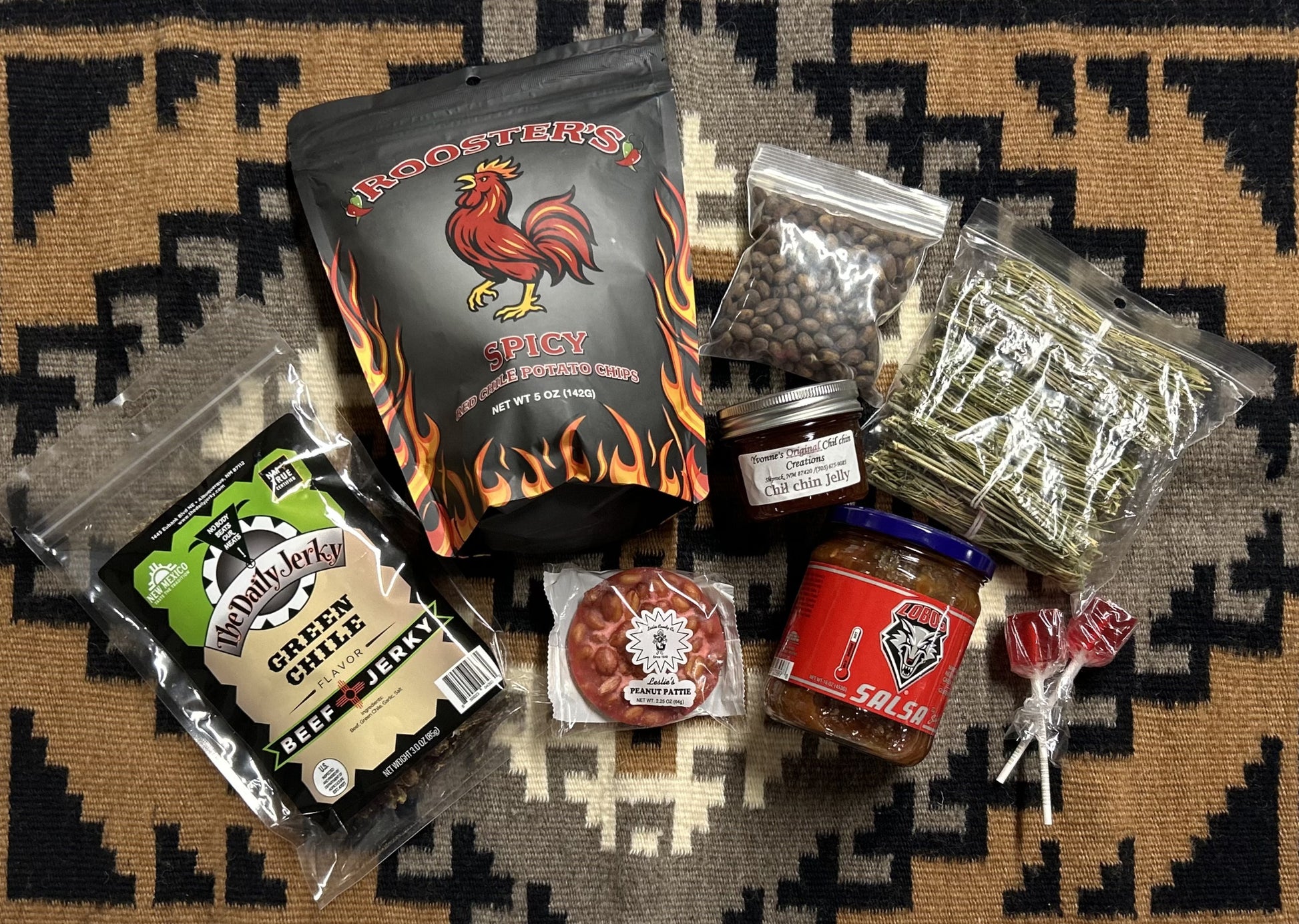 Spicy NM Chile Chips, Green Chile Beef Jerky, Peanut Pattie, Chiiłchin Jelly, Piñons, Navajo Tea, Sadie's Salsa, Cinnamon suckers